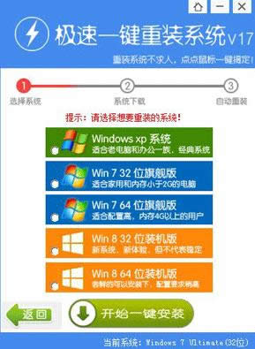 系統軟件是指控制和協調計算機及外部設備,支持應用軟件開發和運行的系統,是無需用戶干預的各種程序的集合,主要功能是調度,監控和維護計算機系統;負責管理計算機系統中各種獨立的硬件,使得它們可以協調工作。系統軟件使得計算機使用者和其他軟件將計算機當作一個整體而不需要顧及到底層每個硬件是如何工作的。 有朋友問小編系統重裝xp怎么安裝。小編為朋友推薦了一款極速一鍵重裝軟件給朋友進行一鍵重裝xp系統。接著來看看系統重裝xp怎么安裝的吧,相信你看完了極速一鍵重裝xp系統教程之后很快就知道系統重裝xp怎么安裝了。好了,來看具體的教程吧! xp系統重裝步驟: (打開軟件)點擊下載軟件,并正常打開,點擊軟件主界面的"點此開始重裝系統",如果你本機中已經有過GHO鏡像文件,則可以用"備份/還原系統"來還原! 系統重裝xp怎么安裝圖1 (選擇系統)根據您個人喜好和電腦的配置選擇需要系統,直接點擊"開始一鍵安裝"即可,一般情況下單核處理器選擇XP,雙核和四核選擇win7,小于2G內存選擇32位,反之選擇64位! 系統重裝xp怎么安裝圖2 (下載安裝)選擇好系統以后,點擊執行下一步后就進入了系統鏡像下載窗口,這時候你能做的就是等待,系統在下載完成后會自動安裝系統