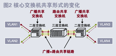 三層結(jié)構(gòu)最有效 細心的讀者可能還會發(fā)現(xiàn),圖2所示網(wǎng)絡(luò)中的VLAN沒有體現(xiàn)VLAN技術(shù)的原始目的——不同物理位置上的計算機能像在同一物理網(wǎng)中一樣相互訪問。這個問題正是本文涉及的核心問題,也是針對規(guī)劃、部署VLAN提出的新觀點:在網(wǎng)絡(luò)中,特別是較大型網(wǎng)絡(luò),不要企圖利用VLAN去實現(xiàn)不同物理位置上計算機的互聯(lián)互通,互通性要由路由策略去實現(xiàn)。這在以往會有些問題,但網(wǎng)絡(luò)技術(shù)發(fā)展到今天,交換機與路由器間的差別變得越來越小,原來用二層實現(xiàn)的方法很多都能夠用三層技術(shù)所代替。用三層技術(shù)代替二層的功能有很多優(yōu)點,主要表現(xiàn)在:結(jié)構(gòu)更加清晰、控制更加豐富、擴展更加靈活、網(wǎng)絡(luò)更加穩(wěn)定、實現(xiàn)更加容易。 繼續(xù)分析圖2中所存在的問題不難看出,盡管核心交換機被共享的形式改變了,但仍存在受到各VLAN出現(xiàn)異常情況的影響。要想避免核心交換機受到各個VLAN的影響、減小影響范圍、避免全網(wǎng)癱瘓的發(fā)生,很容易想到在核心交換機和劃有VLAN的交換機之間加上一層,以隔離核心交換機和各個VLAN。這時就形成了目前較為流行的三層拓撲結(jié)構(gòu)的網(wǎng)絡(luò),如圖3所示。 在三層網(wǎng)絡(luò)結(jié)構(gòu)中,匯聚層與核心層之間的區(qū)域不再有VLAN,匯聚層交換機的VLAN也僅限于部分端口,這時匯聚層交換機成為被“路由共享”的交換機,而且這種“路由共享”比圖2的情況更弱。 如果使匯聚層交換機的性能遠高于接入層的交換機,那么由VLAN的廣播(多由病毒引起)所引起的整網(wǎng)癱瘓問題就基本解決了。 任何方案都具有利的一面和不利的一面,三層拓撲結(jié)構(gòu)的網(wǎng)絡(luò)也會帶來一些問題:1)利用一般的手段較難實現(xiàn)對各個VLAN進行集中式的遠程管理,對于這個問題的解決方案可充分利用網(wǎng)管軟件。2)由于VLAN數(shù)量的增多、路由協(xié)議等技術(shù)的引入,此時的網(wǎng)絡(luò)會比二層平面交換網(wǎng)絡(luò)要復雜,對網(wǎng)絡(luò)技術(shù)人員的要求更高,管理維護成本會有所增加。 這兩點是大型網(wǎng)絡(luò)管理本身的要求,大型網(wǎng)絡(luò)的管理不可能不使用網(wǎng)絡(luò)管理工具,技術(shù)人員的缺乏更是各個企業(yè)都面臨的問題,對此有的專家提出了“IT物業(yè)”的理念,也許這就是將來解決這個問題的最終方案。 【相關(guān)文章】