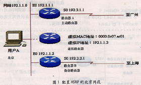 網絡技術是從1990年代中期發展起來的新技術,它把互聯網上分散的資源融為有機整體,實現資源的全面共享和有機協作,使人們能夠透明地使用資源的整體能力并按需獲取信息。資源包括高性能計算機、存儲資源、數據資源、信息資源、知識資源、專家資源、大型數據庫、網絡、傳感器等。 當前的互聯網只限于信息共享,網絡則被認為是互聯網發展的第三階段。 對于IP網絡來說,Cisco的熱備份路由協議(HSRP, Hot Standby Routing Protocol)允許網絡在一個路由器失效不能工作時,網絡中的另一個路由器自動接管失效路由器,從而實現IP路由容錯。HSRP協議還允許兩個或多個配置HSRP協議的路由器使用一個虛擬路由器的MAC地址和IP地址。 虛擬路由器物理上并不存在,它表示一個能為它們提供備份容錯的公共路由器對象。圖1顯示了配置HSRP協議的廣域網中的北京網段。其中,每個物理路由器都配置了虛擬路由器的MAC地址和IP地址。 在圖1中,虛擬路由器的MAC地址是0000.0c07.ac01。當配置HSRP協議時,路由器自動地在Cisco IOS軟件的地址池中選擇一個虛擬MAC地址,該虛擬MAC地址在Cisco 公司的MAC地址塊范圍內。以太網和FDDI局域網使用預先指定的MAC地址作為虛擬MAC地址,令牌環局域網使用一個功能地址作為虛擬MAC地址。 在圖1中,網絡192.1.1.0中的主機的缺省路由器沒有設置為路由器A,而設置為虛擬路由器的IP地址。當用戶A的工作站給位于廣州網段的用戶B的工作站發送數據包時,它將數據包發送到虛擬路由器的MAC地址。