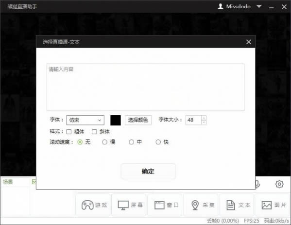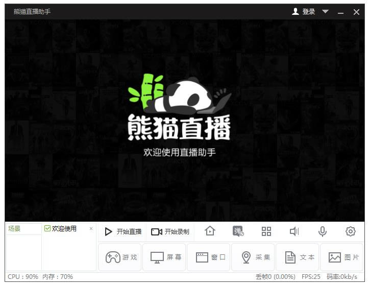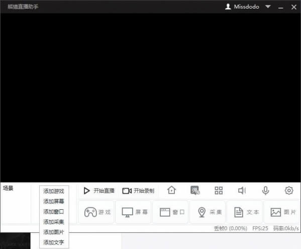 主界面下方有游戲,屏幕,窗口,采集,文本,圖片六種直播內容添加按鈕。