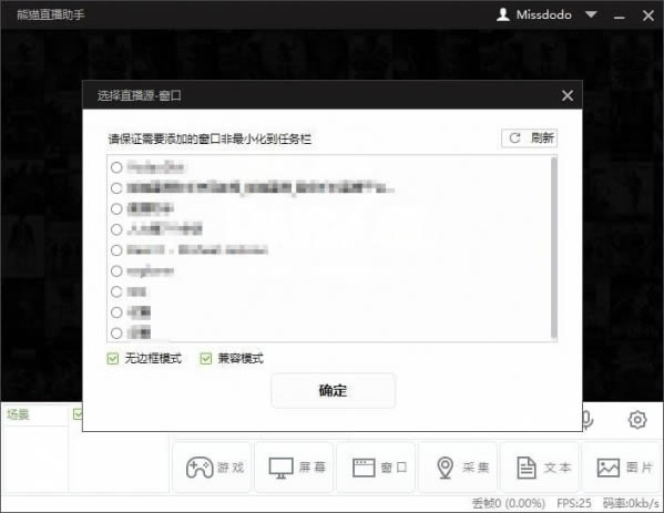點擊“窗口”按,自行選擇窗口進行直播,自行無邊框模式