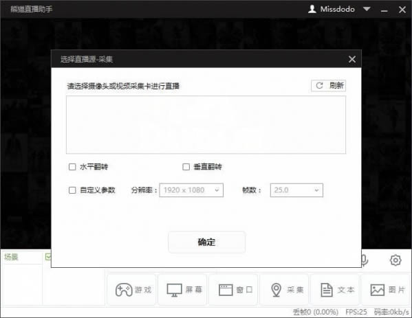 點擊“采集”按鈕,助手會提示你添加直播源,直播源可以是攝像頭或者視頻采集卡,主播可以自行選擇進行直播。
