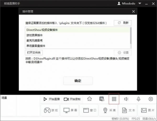 助手支持第三方插件,主播自行下載第三方插件放入指定文件夾內。在場景中添加插件即可以使用。添加完畢之后,在場景中選擇添加完的插件即可以使用。兼容32位OBS插件,64位系統也可下載32位的OBS插件放入指定文件夾內。