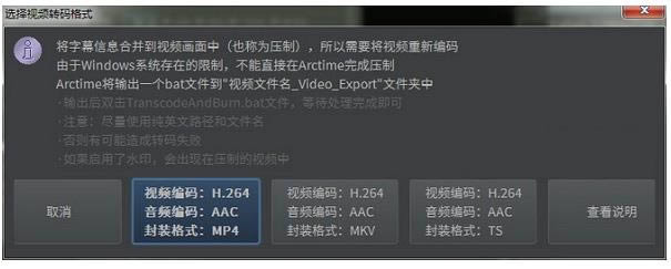Arctime提供了一鍵壓制字幕的功能,完成字幕的創建之后,只需點擊視頻轉碼按鈕即可完成字幕的壓制工作,壓制選項為視頻編碼H264,可選mp4,mkv,TS三種封裝格式。不過由于windows系統的限制,轉碼不能直接在arctime完成,軟件會生成bat文件,在命令行窗口完成轉碼過程。