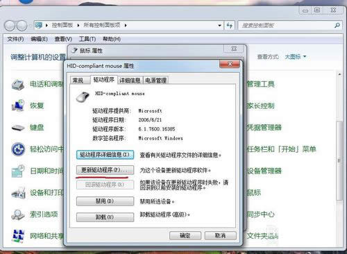 軟件是一系列按照特定順序組織的計算機數據和指令的集合。一般來講軟件被劃分為編程語言、系統(tǒng)軟件、應用軟件和介于這兩者之間的中間件。硬件是“計算機硬件”的簡稱。與“軟件”相對,電子計算機系統(tǒng)中所有實體部件和設備的統(tǒng)稱。 在使用電腦鼠標的過程中,一些網友會遇到移動手上的鼠標之后,電腦屏幕上的鼠標不動的問題,那么,鼠標不動了怎么辦?今天的電腦教程,小編就來介紹一下鼠標不動了的解決方法,一共有2個解決方法,網友可以根據實際情況進行選擇! 方法一:如果遇到鼠標突然無效的情況,可以嘗試一下將鼠標從電腦上拔下來,隔一段時間再次連接即可解決問題。 方法二:可以更新一下鼠標的驅動,具體方法如下: 1、在控制面板中,我們找到鼠標的項目,點擊打開它。 2、在打開的鼠標屬性窗口中,切換到硬件選項,在里面我們點擊屬性。 3、在打開的窗口中我們選擇下面的改變設置。 在打開的屬性窗口,我們只里面切換到驅動程序,然后在里面我們點擊更新驅動程序,如圖,隨后電腦將會重新安裝一次鼠標的驅動就能夠使用。 硬件是實在的,有模有樣的。軟件是程序性的。是一系列的指令。有了軟件,硬件才會實現(xiàn)更豐富的功能。 |