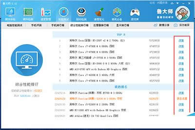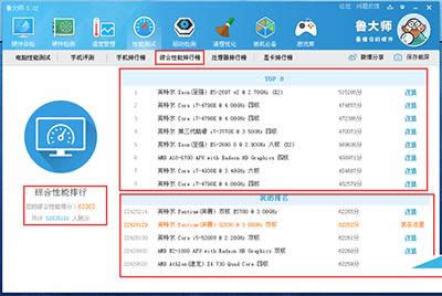 2、點(diǎn)擊旁邊“綜合性能排行榜”,在此頁(yè)面可以看到你的綜合性能得分、共計(jì)有多少人跑分、綜合性能排行榜前八名、我的排名等等信息。如下圖所示