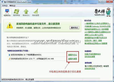 1、魯大師電腦優化分為四個功能:漏洞修復,高級優化,高級清理。 ![]() 魯大師 2、打開“電腦優化”,將自動進行優化的檢測,找出潛在的安全隱患和垃圾文件等; ![]() 魯大師 3、對檢測出來的問題進行優化清理。 硬件是實在的,有模有樣的。軟件是程序性的。是一系列的指令。有了軟件,硬件才會實現更豐富的功能。 |