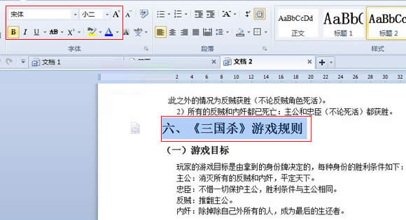 軟件是一系列按照特定順序組織的計算機數(shù)據(jù)和指令的集合。一般來講軟件被劃分為編程語言、系統(tǒng)軟件、應用軟件和介于這兩者之間的中間件。硬件是“計算機硬件”的簡稱。與“軟件”相對,電子計算機系統(tǒng)中所有實體部件和設備的統(tǒng)稱。 在編輯完文字后,常常要對文字大小,顏色,以及文章的排版進行修改,如果一處文字的字體正好與多處文字的設置一樣,那么就可以用格式刷的功能來進行操作,不需要一個一個重復操作。 操作步驟: 1、啟動WPS文字,隨便打開一篇文檔,以便演示。可以看到三國殺游戲規(guī)則幾個字是宋體小二格式的。