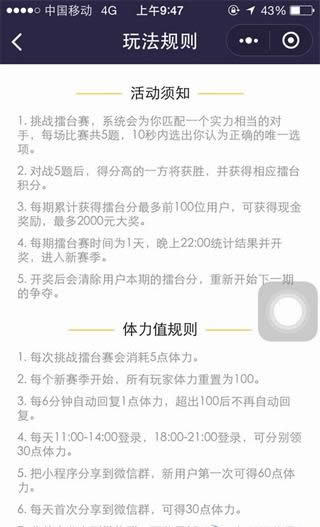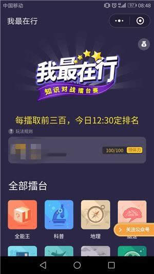 2、進(jìn)入到小程序內(nèi)之后,就可以開始游戲了。這里有很多類型的知識競賽項(xiàng)目,你可以選擇一個(gè)你擅長的項(xiàng)目進(jìn)行挑戰(zhàn);