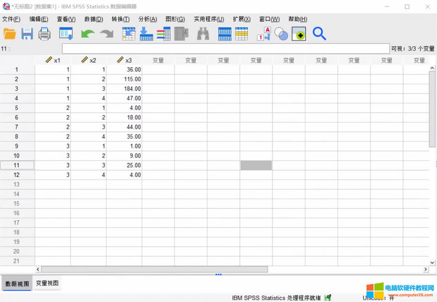 圖1:數據展示 如圖所示,我們將數據導入到SPSS中。