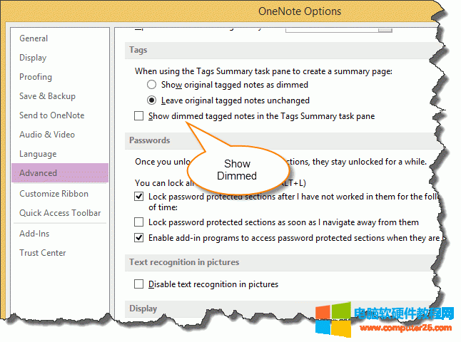 在 OneNote 選項窗口中, 可以設(shè)置 - 在"標(biāo)記摘要"任務(wù)窗格中變暗顯示帶標(biāo)記筆記.