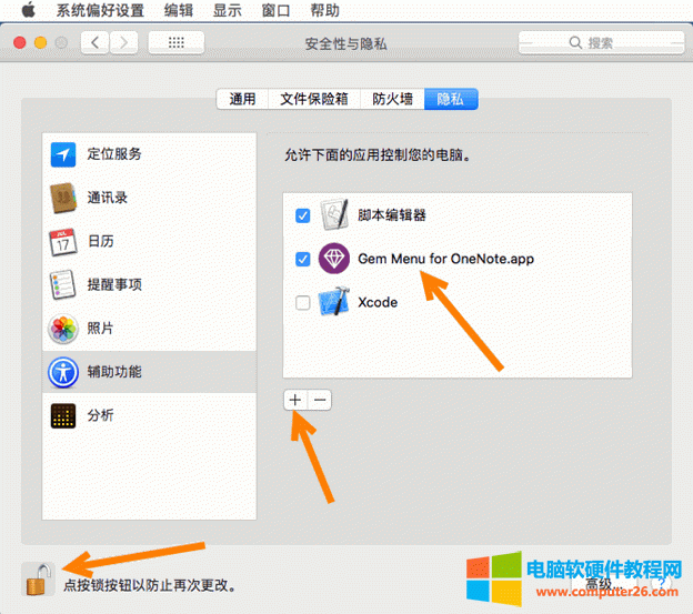 添加 應用程序 / 實用工具 下的 Gem Menu for OneNote.app, 并打勾以允許應用控制您的電腦。