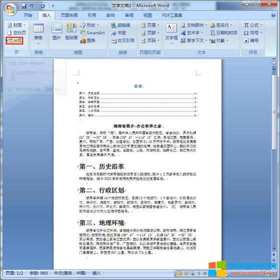 第四步:生成目錄后,繼續(xù)將鼠標(biāo)保持在標(biāo)題『湖南省簡(jiǎn)介--辦公軟件之家』前,然后點(diǎn)擊『插入』功能菜單,再點(diǎn)擊『分頁』功能;