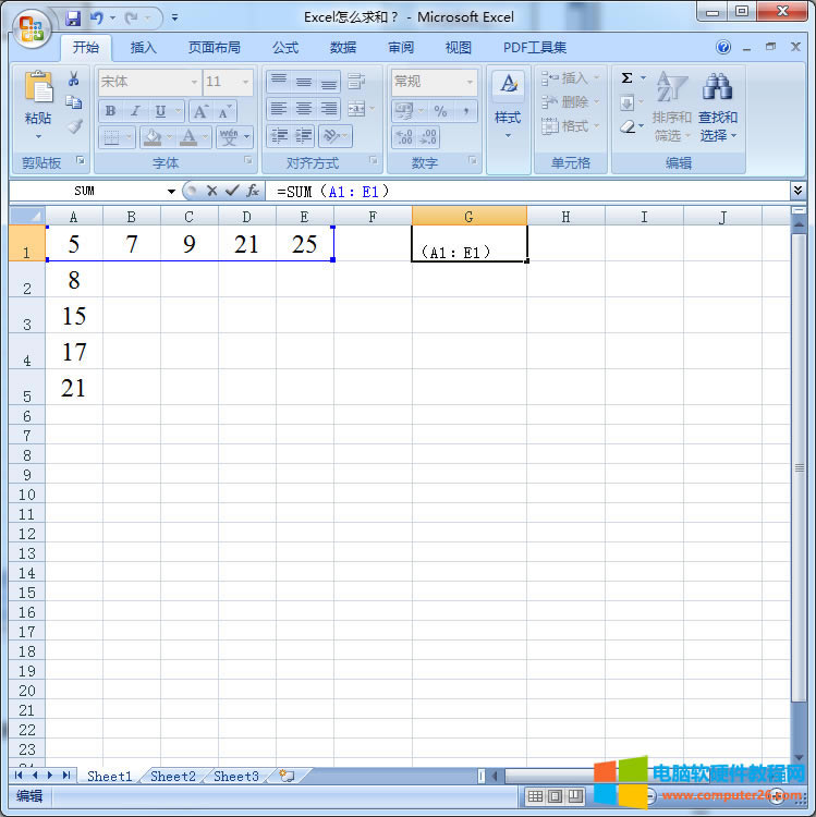 第一步:選中求和數(shù)字所在的單元格(本次演示將第一行5個(gè)數(shù)字的和安置于G1單元格),然后在excel的輸入窗口中輸入命令=SUM(A1:E1);