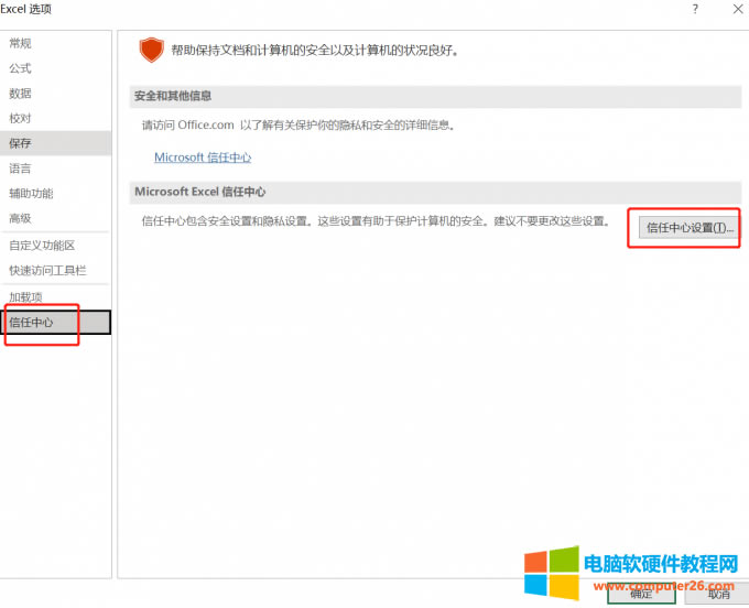 2、進(jìn)入“Excel選項(xiàng)”彈窗操作界面,點(diǎn)擊“信任中心”,點(diǎn)擊“信任中心設(shè)置”;