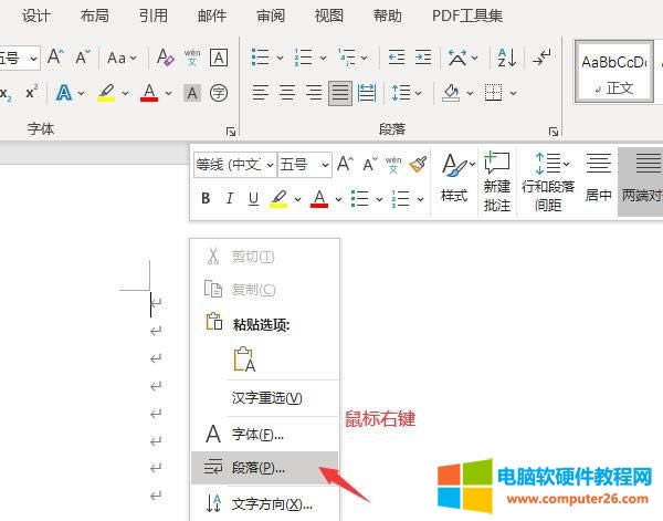 如圖1所示,將光標(biāo)放置在需要插入下劃線的位置,點(diǎn)擊鼠標(biāo)右鍵打開(kāi)快捷菜單欄,選擇其中的“段落”命令。