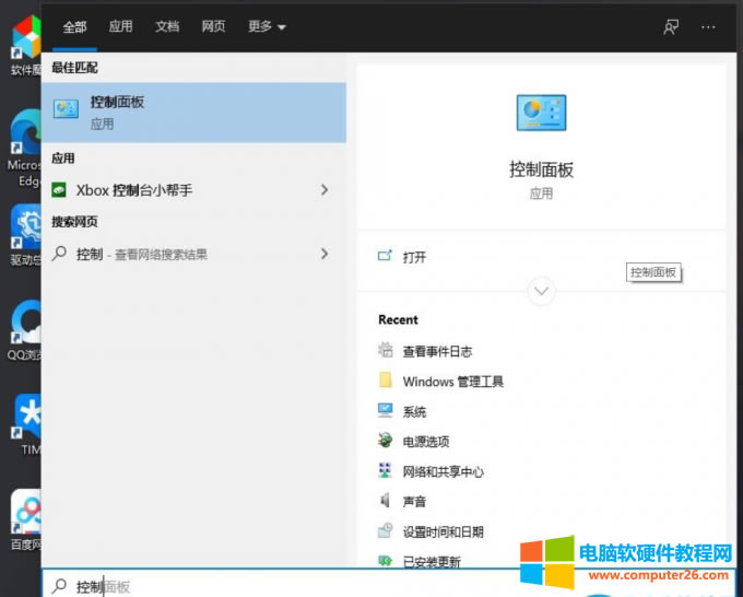 1.按下鍵盤上的Windows+S鍵,在搜索框內(nèi)輸入“控制面板”,點(diǎn)擊進(jìn)入。