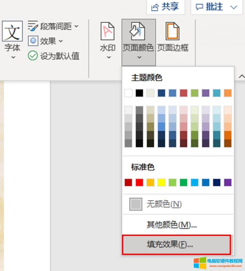 如圖6所示,展開頁面顏色的下拉菜單,選擇“填充效果”。