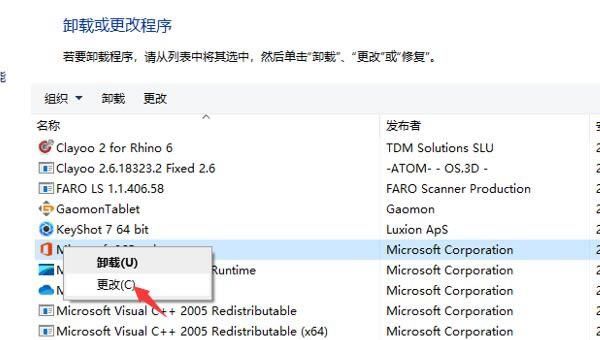 3.更改命令 如圖11所示,在列表中找到Microsoft軟件,點(diǎn)擊鼠標(biāo)右鍵,使用列表中的“更改”命令。 圖11:更改命令