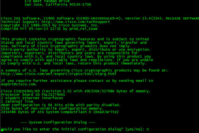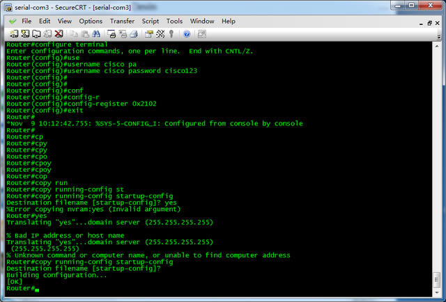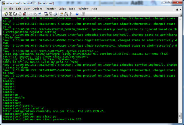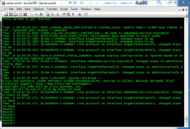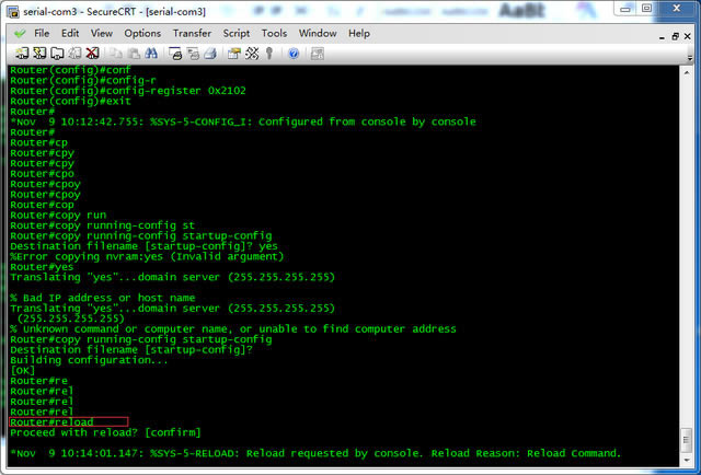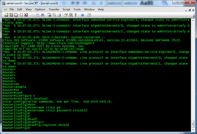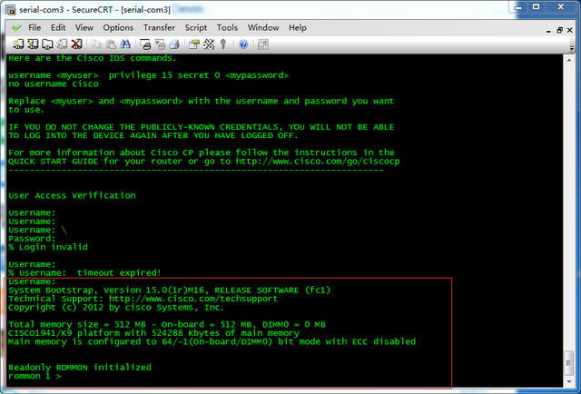 Cisco 1941破解密碼 將鍵盤連接到筆記本電腦,因為沒有筆記本電腦Break鍵,所以要把USB鍵盤連接筆記本,打開SecureCRT連接路由器。 如下圖所示: ![]() (注意這里的鍵盤是連接筆記本,而不是連接1900路由器后面USB口) 重新啟動路由器,然后啟動,始終按鍵盤Ctrl Break鍵,直接看到進入ROMMON1 ![]() 進入ROMMON1之后更換寄存器的值 Confreg 0x2142 0x2142直接跳過配置文件,直接進入路由器。 ![]() 配置完成后,路由器將重新啟動,然后路由器將自動加載初始配置 ![]() 這里都選擇no ![]() 然后可以通過一系列的啟動順利進行Router>界面 ![]() 不輸入密碼即可進入enable,這里不需要配置usename和password,配置用戶名和密碼時,需要將其掛載line console 0 直到口上才開始。 ![]() 配置完成后,將寄存器值替換為正常可保存的0x2102 ![]() 配置完成后,保存啟動路由器。 ![]() 可以調協enable password cisco123 進入特權模式時,需要輸入密碼 cisco123 ![]() |