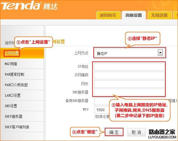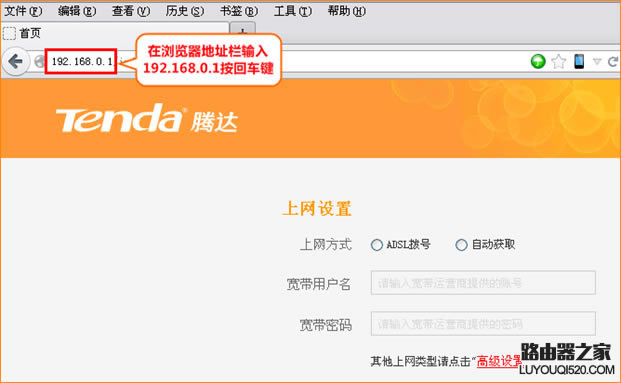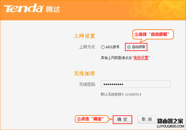 如何安裝騰達無線路由器?如何有線無線上網?本文針對騰達(Tenda)無線路由器產品,具體介紹了如何配置路由器上網的過程。 將路由器連接到外網: 接入電話線的用戶(請準備兩條短網線) a.(有ADSL Modem貓) 接貓的電話線(細線)line口(較小的口),貓分開一條網線連接路由器WAN口 (藍色),找一條短網線,一端接電腦,一端接路由器1/2/3/4任意接口(黃色),接線方式如下圖所示: ![]() 直接進入網線的用戶 b、(無ADSL Modem貓)直接將網線連接到路由器WAN口(藍色),找一條短網線,一端接電腦,一端接路由器 任/2/3/4任1/2/3/4,接線方式如下圖所示: ![]() 注:通電后,路由器正常工作SYS指示燈閃爍,WAN指示燈常亮或閃爍,1/2/3/4口與電腦相連的端口指示燈常亮或閃爍。如果路由器相應端口的指示燈不亮或計算機的網卡圖標顯示紅叉 ,說明線路連接有問題,試著檢查下網線連接或換根網線。 本地連接電腦IP地址設置為自動獲取IP地址” win7等系統參考:如何使用計算機ip自動獲取地址 1.右鍵單擊桌面上的網上鄰居,選擇屬性: ![]() 2.點擊本地連接,選擇屬性: ![]() 3.雙擊“Internet 協議(TCP/IP) ![]() 4.選擇自動獲取IP自動獲取地址DNS服務器地址 ![]() 1.在瀏覽器中登錄路由器管理界面 中輸入:192.168.0.1 按回車鍵。 192.168.0.1 請閱讀:路由器管理界面192.168.0.1打不開怎么辦? ![]() 2.選擇正確的上網方式(常見的上網方式有)PPPOE、動態IP、靜態IP三、不知道如何選擇上網方式,請點擊閱讀:如何選擇路由器上網方式); ADSL選擇在設置頁面中選擇ADSL撥號”, 將寬帶用戶名和密碼輸入寬帶用戶名和寬帶密碼 ,點擊確定即可。 ![]() 自動獲取(動態IP):在設置頁面中選擇自動獲取-點擊確定。 ![]() 自動獲取(動態IP):在設置頁面中選擇自動獲取-點擊確定。 ![]() ![]()