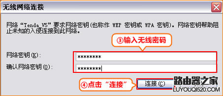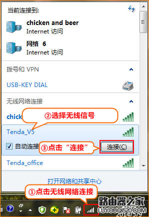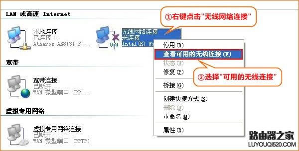 溫馨提示:路由器正常上網后,無需點擊寬帶連接即可直接上網;如果還有其他電腦需要上網, 將計算機直接連接到路由器1234的任何空閑接口,并將本地連接改為自動獲取IP沒有必要配置路由器。 如果不能上網,推薦閱讀:路由器設置好但連接不上網怎么辦? 如有筆記本、手機等無線設備上網,請看下一部分無線設置。 無線設置: 請記住前一步三中無線路由器修改的無線名稱和密碼,點擊\\"無線設置-無線基本設置\\"查看無線SSID 點擊(無線信號名稱)\\"無線設置-無線安全-無線安全\\"-查看無線安全密鑰(第一次連接無線信號需要輸入的密碼)。 a: 若要使用計算機無線連接路由器,首先要確保您的計算機配備無線網卡并能正常工作,對于不同的操作系統,其搜索 ![]() XP系統: ![]() 點擊桌面上的在線鄰居-選擇屬性-右擊無線網絡連接-選擇查看可用的無線連接 ![]() 在信號列表中選擇無線路由器信號,然后單擊連接 點擊連接輸入無線密碼。 ![]() Windows 7/Vista系統: ![]() l 點擊桌面右下角的無線網絡連接圖標 ,在打開的信號列表中選擇路由器的無線信號,然后單擊連接按鈕。 輸入無線密碼后,點擊確定