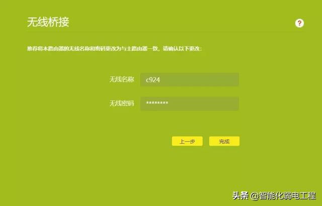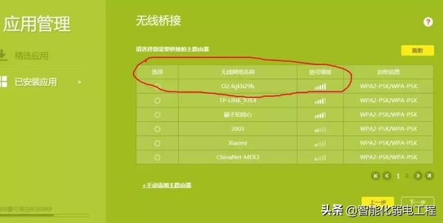 無線橋接比有線節省了布線步驟,也很方便,特別是對于房屋相對較大,無線橋接更為必要,可以增加副路由器無線橋接(WIFI無線中繼),將WIFI信號延伸到需要的地方,我們來看看步驟。 路由器無線橋接步驟 首先,你必須有兩個路由器。我們分別稱兩個路由器為主路由和副路由。主路由首先連接到網絡,副路由用于橋接主路由WiFi信號。 ![]() 一、設置主路由器 1.設置主路由正常連接到網絡。一般來說,主路由是能正常上網是的,所以和以前一樣,不需要設置主路由器。 我們只需要知道主路由WiFi名稱和密碼可以,假設主路由WiFi名稱為“O2.4gkb29b”,WiFi密碼為12345678 二、設置副路由器 1.首先進入副路由設置界面。用電腦連接副路由WiFi(當然也可以用傳統的網線連接電腦,可以連接)。 ![]() 2.打開電腦/手機上的任何瀏覽器,登錄副路由器(弱電君就行tp-link以副路由器為例,一般默認登錄地址為192.168.1.1)。 3.進入副路由器后,點擊【應用管理】——【無線橋】 ![]() 可以看到,主路由器的wifi名稱在列表中。 ![]() 選擇主路由器wifi名稱,然后點擊下一步,輸入主路由器的wifi密碼(所以記住主路由器wifi密碼)。 ![]() 輸入后,就成功連接到了主路由器了,為了防止ip主路由器自動分配沖突ip地址給副路由器,這個ip主路由器地址ip屬于同一網段。 弱電君在這里說,這個ip地址有什么用? 這個ip橋接成功后,地址為,登錄副路由器的ip地址。 ![]() 下一步是設置副路由器新的無線名稱和無線密碼。我們將無線名稱設置為c924記住這個名字(也可以隨意設置其他),然后保存。 ![]() 其實這一步已經到了副路由器的無線橋接已完成,點擊后,副路由會自動重啟,重啟后,即可wifi在信號中找到副路由器,輸入新設置的密碼,直接連接到副路由器。 驗證橋接是否成功 由于主副路由器的橋接已經完成,我們來驗證下,驗證上副路由器能否連接。 連接副路由器wifi試試,在wifi在信號中找到新設置的副路由器wifi名稱:c924,輸入密碼連接。 ![]() 這是新設置的副路由器wifi名稱”c924“,已成功連接上了。 事實上,連接是否成功,也可以直接返回副路由器的主界面,已顯示無線橋接成功。 ![]() 橋接的整個過程設置也很簡單。 補充: 在弱電君的補充下,這里可以看到一種現象,即橋接成功后,副路由器的登錄地址發生了變化, 未橋接前:副路由器的默認登錄地址是192.168.1.1, 橋接后:副路由器的登錄地址變為10.168.1.208,主路由器ip地址為同一網段。因此,如果以后進入副路由器,則需要輸入ip地睛10.168.1.208進入了。因此,如果以后進入副路由器,則需要輸入ip地睛10.168.1.208進入了。 ![]() |
