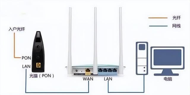 網(wǎng)絡(luò)運(yùn)營(yíng)商提供的入戶線路是光纖,入戶后需要先接入光貓轉(zhuǎn)換,將網(wǎng)線從光貓連接到路由器WAN然后從路由器連接電腦: ![]()