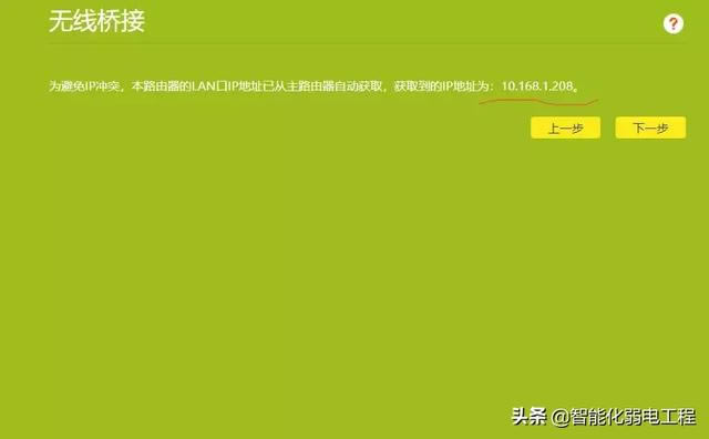 橋接的整個過程設置也很簡單。 補充: 在弱電君的補充下,這里可以看到一種現象,即橋接成功后,副路由器的登錄地址發生了變化, 未橋接前:副路由器的默認登陸地址是192.168.1.1, 橋接后:副路由器的登錄地址變為10.168.1.208,主路由器ip地址為同一網段。因此,如果以后進入副路由器,則需要輸入ip地睛10.168.1.208進入了。因此,如果以后進入副路由器,則需要輸入ip地睛10.168.1.208進入了。