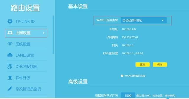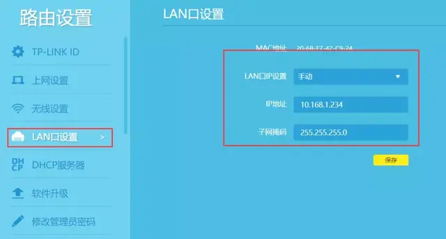 可以看到,路由器2的 wan口自動獲取ip地址是10.168.1.207,我們的主路由器10.168.1.在同一網段。 3.設置路由器2LAN口ip點擊路由器2的設置界面LAN口設置”——>右側“ LAN口IP選址:手動手動,修改為:192.168.2.1——>單擊保存,然后提示重啟路由器。 備注:若主路由器ip地址為192.168.1.1的話,那么路由器2的LAN口就設置成192.168.2.一、二級路由器LAN的ip主路由器ip 不在同一網段![]()