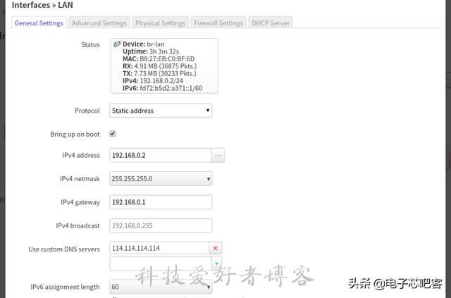 修改openwrt密碼 四、樹莓派openwrt連接互聯網由于樹莓派的網線與電腦相連,暫時沒有互聯網連接。現在配置樹莓派openwrt,將其連接到互聯網上。這一步的配置和樹莓派安裝 OpenWrt 創建超級路由器完全一樣。 1.修改”lan”配置在“LAN點擊口配置edit”,進入“LAN”口配置 ![]() 2.配置’LAN’口 配置LAN口為靜態IP地址,因為我家的路由器IP地址是192.168.0.1,掩碼為255.255.255.255.0,故我的WAN 口配置成IP為192.168.0.2, 掩碼同樣為255.255.255.255.0,網關地址為192.168.0.1,DNS地址填了“114.114.114.114”和“223.5.5.5”。如下圖所示。如下圖所示。 ![]()