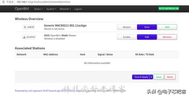 輸入密碼登錄。這時,樹莓派openwrt已連接到互聯網。 五、配置樹莓派openwrt無線wifi在配置界面上,可以看到樹莓派的無線是關閉的,無線功能首先在這里打開。(注:樹莓派3B和樹莓派4B板載wifi ,所以不需要像樹莓派2B一樣安裝驅動器。 點擊“network”-“Wireless”,然后將SSID:OpenWrt 打開。 ![]()