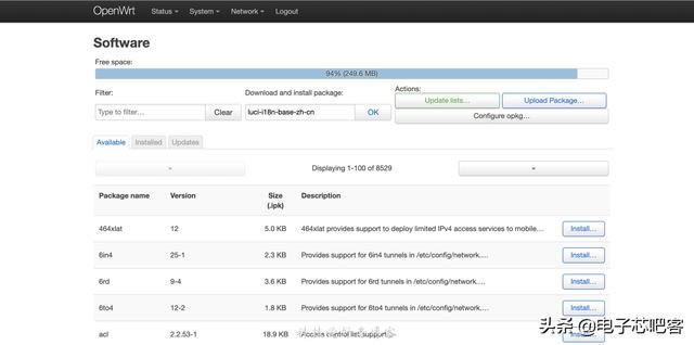 樹莓派openwrt路由器測速 根據以上測量,覆盆子派不是不可能做路由器。近距離使用時,上傳下載速度不亞于傳統路由器。但由于覆盆子派沒有外部無線天線,信號強度相對較低。 Openwrt漢化Openwrt安裝后是英文版,對普通人不友好,可以通過安裝中文漢化包來解決。步驟如下: 1.更新Openwrt軟件包點擊“update lists等待更新完成。 ![]()