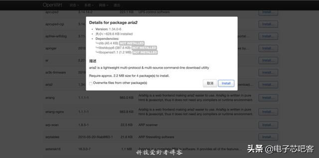 openwrt更新軟件包 2.安裝中文補丁輸入軟件包搜索框luci-i18n-base-zh-cn跳出的確認框Really attempt to install luci-i18n-base-zh-cn?選擇安裝 ![]()
