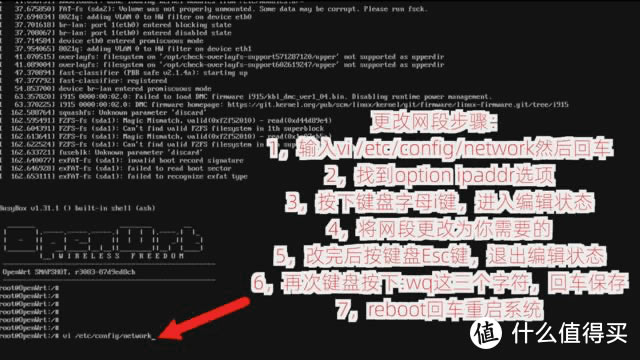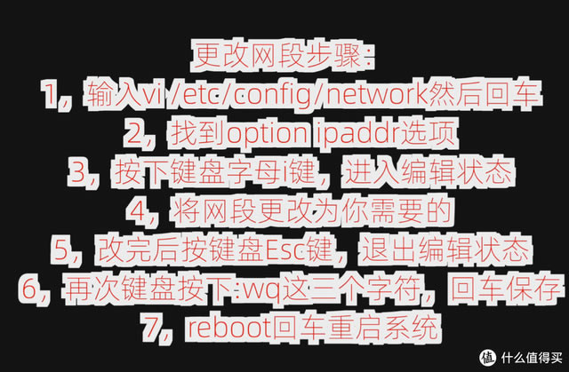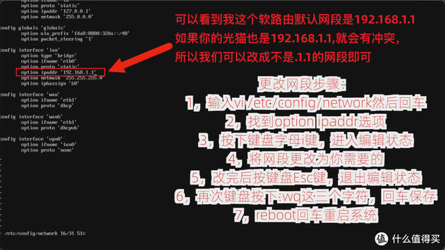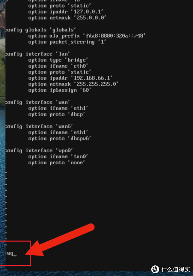 ![]() 可的固件默認(rèn)網(wǎng)段是192.168.1.1,如果你家里的路由器或光貓也是192.168.1.1網(wǎng)段,會(huì)有沖突,所以我們按鍵盤上下左右鍵,將光標(biāo)移動(dòng)到option ipaddr 192.168.1.在這一行的尾部,我們將修改這個(gè)網(wǎng)段~ ![]() 例如,我想將軟路由網(wǎng)段修改為1922.168.66.1,移動(dòng)這串光標(biāo)ip尾部,按鍵盤上的字母i鍵,進(jìn)入編輯狀態(tài),然后按刪除鍵刪除1.1這幾個(gè)字符,注意,其他字符不要?jiǎng)h了,要保持原樣,然后輸入66.1.修改后唯一的區(qū)別是1變成66,其他字符不能刪除和修改,輸入66.1后,按鍵盤上的鍵盤『Esc』鍵,退出編輯狀態(tài),然后輸入:wq,注意在英語狀態(tài)下輸入以下三個(gè)字符,左下角可以看到輸入