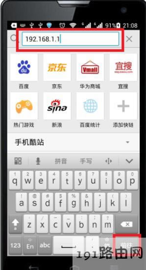 溫馨提示:無線路由器在出廠時,默認已經啟用了無線wifi,并且沒有加密;所以,即使是第一次設置無線路由器上網,手機也是可以先搜索連接到路由器wifi信號的。 二、手機登陸到192.168.1.1頁面 打開手機上的瀏覽器,在瀏覽器的地址欄中輸入:192.168.1.1,打開登陸頁面;然后輸入登陸密碼,登陸到設置界面。如果在手機瀏覽器中輸入192.168.1.1后,打不開登陸頁面,請點擊閱讀文章: 192.168.1.1手機登陸頁面打不開怎么辦 ![]()