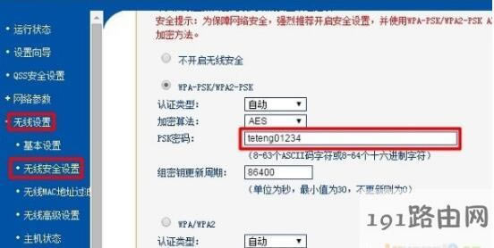 三、修改密碼 1、修改無線wifi密碼 點擊“無線設置”---->“無線安全設置”---->修改右側界面“PSK密碼”后面的值——>點擊頁面下方的“保存”按鈕。注意:“PSK密碼”就是無線wifi密碼。 ![]()