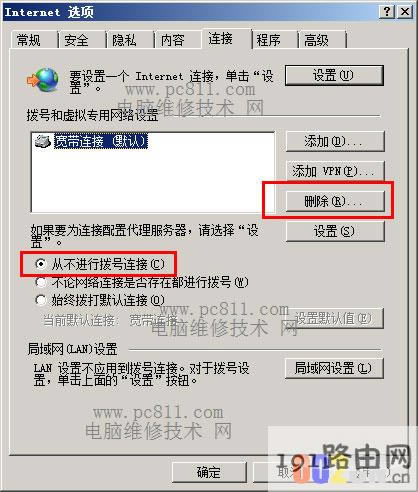 路由器(Router)是連接兩個或多個網絡的硬件設備,在網絡間起網關的作用,是讀取每一個數據包中的地址然后決定如何傳送的專用智能性的網絡設備。 原標題:"登錄192.168.1.1無法打開用戶名和密碼"的相關路由192.168.1.1登錄設置教程。來源 - 本站。 IE上網設置代理第1步:正常打開ie瀏覽器器,并在ie瀏覽器工具欄中找到并打開ie瀏覽器選項。 第2步:在打開的ie瀏覽器選項卡中找到并單擊“連接”。 ![]() 第3步:在打開的“局域網(LAN)設置”窗口中,把“為LAN使用代理.....”前面的勾去掉。 ![]() 路由器LAN接口故障有時是因為路由器LAN接口出現故障,可以嘗試著把網線的水晶頭拔了換另一個LAN接口試一下,插好之后,看一下路由器上的LAN提示燈是否亮著? IE寬帶拔號連接設置有時有些網友上網是使用IE的寬帶連接,一般是不需要這個的,我們可以把這個刪除掉。 第1步:正常打開ie瀏覽器器,并在ie瀏覽器工具欄中找到并打開ie瀏覽器選項。 第2步:在打開的ie瀏覽器選項卡中找到并單擊“連接”。 ![]() 第3步:在連接選項卡中找到"寬帶連接"并刪除,然后選擇“從不進行拔號連接”并確定。 ![]() 網段不同一般來說,默認路由器都會自動分配IP地址,如192.168.1.1的網關路由器,都會分配192.168.1.2到192.168.1.255之間的數字。如果路由器設置了不自動分配,那么可能是因為自己電腦沒有ip地址,我們只需要把IP地址設置成和路由器同一網段即可。有關Windows系統具體的設置IP地址方法,這里就不詳細說明,大家可查閱《ip地址設置方法》。 ![]() 路由器卡死/假死有時天氣過熱,或路由器本身質量不好,或是線路等一些原因導致路由器假死或是死機的情況,大家可嘗試把路由器的電源給拔掉,再插上,等一分鐘有時就好了。 路由器登錄地址錯誤有些路由器是需要輸出端口才能正常登錄,這個商品默認就是80(不需要輸出就直接登錄),如果在路由器控制界面已經修改過登錄登錄端口,就必須加上修改過的商品如“192.168.1.1:端口號”才能登錄。 以上方法均無法解決,可嘗試使用把路由器恢復出廠設置,有關恢復出廠設置方法,本文不在詳細說明. 路由器不僅讓你更穩定快速地連接無線網絡,更可以讓家中的智能設備連接在一起。 |