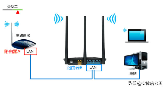 三、連接兩個(gè)路由器當(dāng)路由器A作為主路由器時(shí),我們不需要連接和設(shè)置路由器B。接下來,我們只需要用一根網(wǎng)線插入路由器A、路由器B的LAN就在插口內(nèi)。如下圖:  當(dāng)我們按照上圖連接兩個(gè)路由器時(shí),路由器B完全變成了AP盡管它也提供了交換機(jī)的功能WiFi網(wǎng)絡(luò),但這個(gè)WiFi網(wǎng)絡(luò)和路由器A提供相同的網(wǎng)絡(luò)。