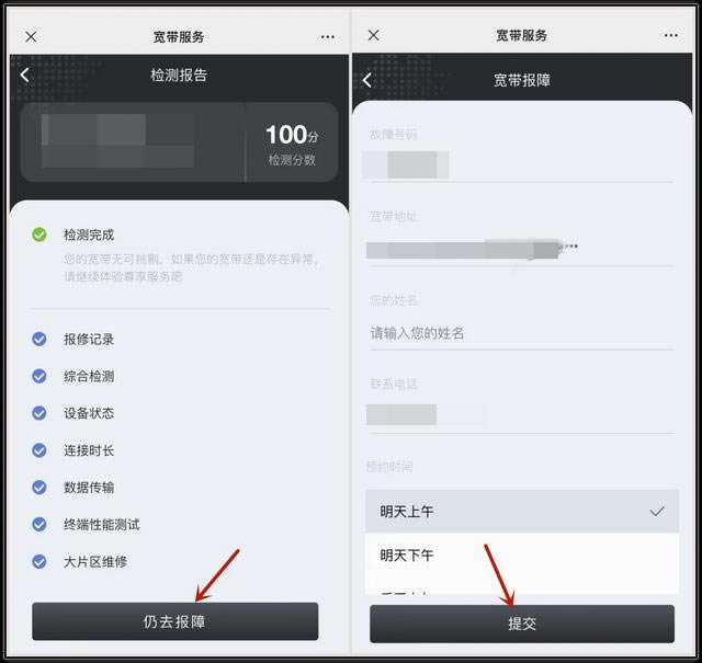 如仍不能恢復(fù),可選擇報(bào)障預(yù)約師傅上門處理,一鍵報(bào)障快速完成!▼▼▼ 別擔(dān)心家里突然斷網(wǎng) 學(xué)習(xí)上述方法可以快速處理 大家都可以多試試。 如果這些方法不起作用的話您可以撥打10000號(hào)聯(lián)系客服