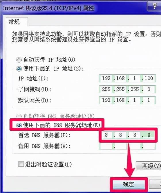 繼續在協議屬性窗口中找到使用以下內容DNS修改服務器地址的首選DNS您可以嘗試將服務器設置為8.8.8.這是通用的DNS然后點擊確定服務器地址進行嘗試。