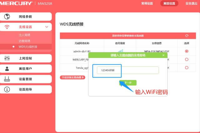 點擊下一步,WDS無線橋接功能將自動搜索附近可連接的功能WiFi如果用戶知道網絡WiFi密碼,以“admin-db以1181為例: ![]()