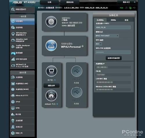 3 UI設計與功能簡介 UI設計與特色功能 看完外觀,我們再來看看華碩RT-AX88U的UI設計和一些功能設置。如下圖所示,華碩RT-AX88U遵循華碩以往豐富的固件界面風格:左上為一般設置,左下為先進設置。頂部是幾個快速功能,包括快速打開游戲加速和彈出U盤。中間是路由器狀態概述,右邊是系統信息。