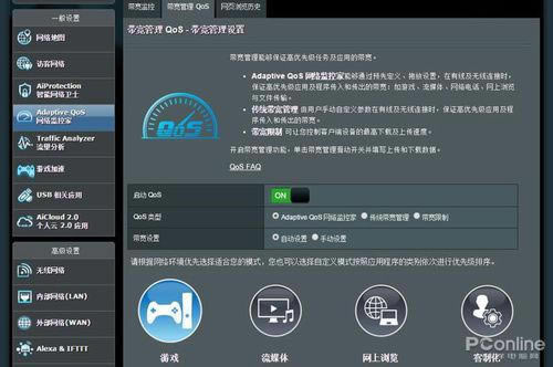 ▲Adaptive QoS網絡監控器可以保證游戲、流媒體、網上瀏覽、文件傳輸等高優先級應用和程序傳輸的帶寬,通過預定義和拖放設置,在有線和無線連接時進行。開啟QoS之后,可以選擇[Adaptive QoS網絡監控器QoS類型,并在下面選擇應用模式優先級。