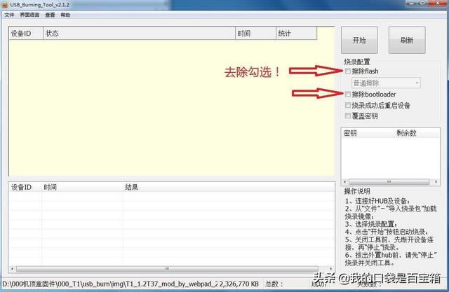 9.加載燒錄包后注意:一定要去掉兩個勾選:擦掉falsh和擦除bootloader; ![]()