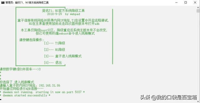 7、下邊T遠程調試在設置中打開, 打開電腦端的降級工具onekey 子目錄下的 run.bat,輸入數字3,輸入線刷模式,然后輸入盒子IP地址,具體看圖 ![]() 降級工具下載地址 https://www.cr173.com/soft/905931.html ![]()