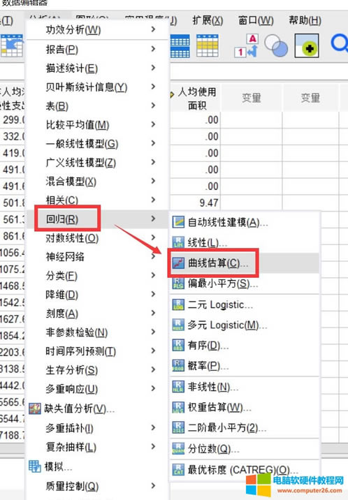 在“分析”菜單中找到“回歸”,點(diǎn)擊其中的“曲線估算”,可以打開曲線估算的分析窗口。