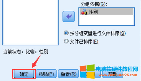 3、點(diǎn)擊右側(cè)的“比較組”選項(xiàng),然后通過(guò)下方箭頭按鈕將性別變量添加至分組框中;
