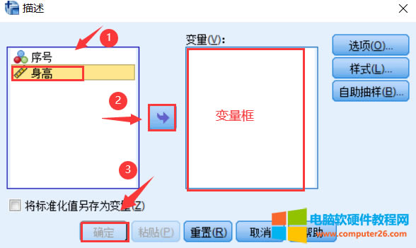7、在彈出的“描述窗口”中,通過(guò)中間的箭頭按鈕將身高變量添加至變量框,點(diǎn)擊確認(rèn);