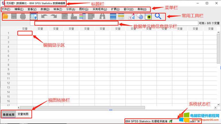 SPSS由IBM公司出品,它提供了包括描述性統計、推斷性統計、因子分析、聚類分析、回歸分析等多種統計分析功能,并包括文本分析、機器學習算法、數據分析模型等。SPSS的界面友好,易于操作,能夠快速從數據中提取有用的洞察和分析,廣泛應用于教育、心理、醫學、市場、人口、保險等多個研究領域,也用于產品質量控制、人事檔案管理和日常統計報表等。 新手學習SPSS最重要的是了解基本的功能。IBM SPSS有一句口號“真正統計,確實簡單”,我們在入門的時候要先學會使用下拉菜單選擇所需要執行的命令,然后是能夠使用各種統計分析繪圖交互界面。新手入門從軟件的五大窗口入手會比較合適,接下來介紹軟件的五大窗口。 SPSS軟件中一共有五個主要的窗口:數據窗口、變量窗口、結果輸出窗口、圖表編輯窗口、程序編輯窗口。作為初學者著重要學習數據窗口和變量窗口,其他三個窗口只需要做了解即可。 1、數據窗口 數據界面主要分為以下幾個方面: 標題欄:標題欄顯示文件的標題。 菜單欄:通過點擊形成下拉菜單,提供軟件的主要功能(如描述統計、均值比較、一般線性模型等)。 常用工具欄:提供軟件內置常用的工具(如剪切、粘貼、清除等)。 數據單元格信息顯示欄:點擊數據單元會顯示該單元格中的具體信息,主要是在單元格中的信息超出單元格范圍時會使用。 編輯顯示區:點擊之后可以直接在編輯顯示區進行數據編輯。 視圖轉換欄:點擊數據視圖或變量視圖按鈕可以在數據界面和變量界面進行轉換。 系統狀態欄:可以在此處查看系統處理數據的狀態,在數據量較大時可以觀察是否在處理或者是已經處理完畢。